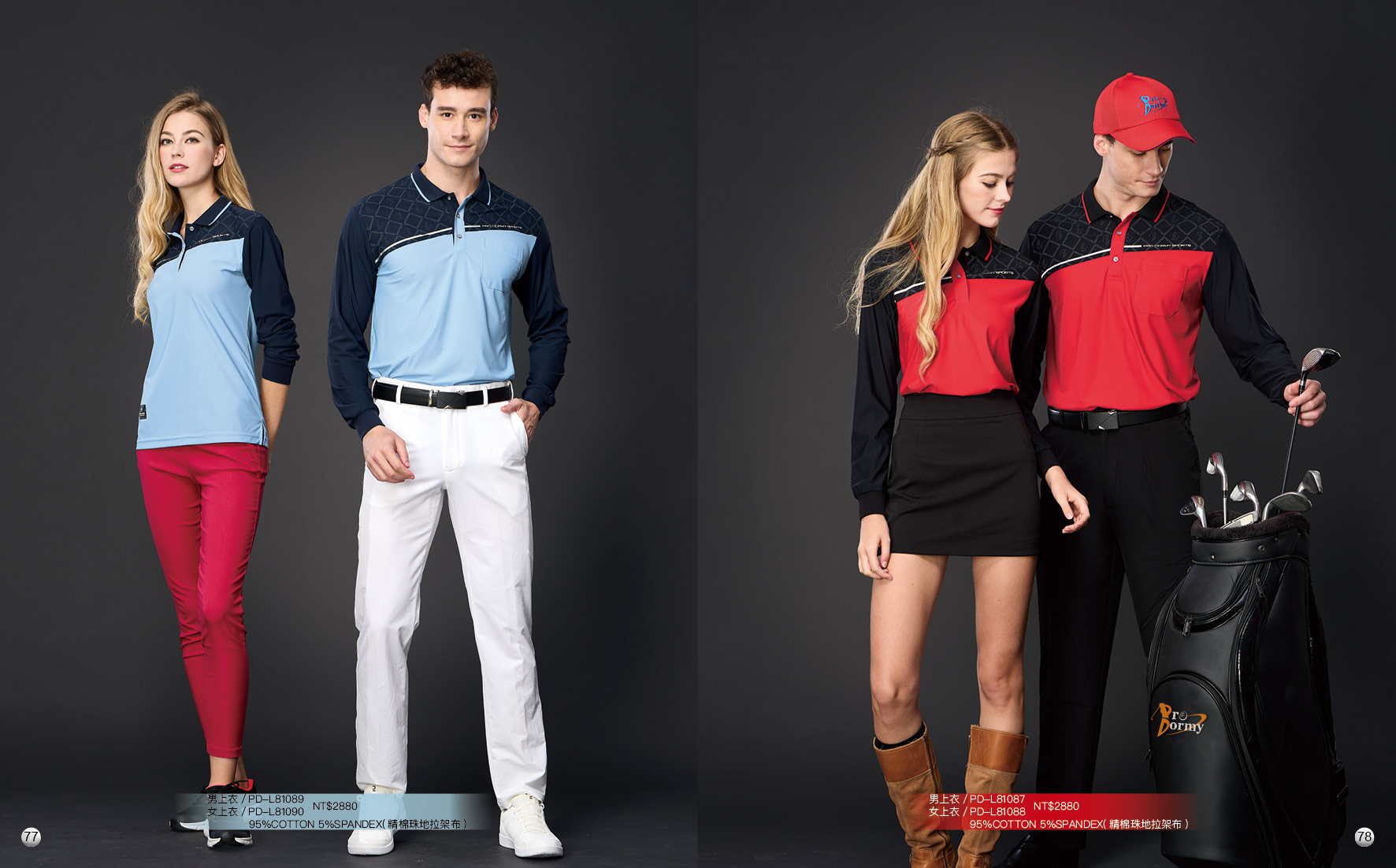 NT$2880 男:PD-L 81087 (紅/黑)、PD-L 81089 (水藍/丈青) 女:PD-L 81088 (紅/黑)、PD-L 81090 (水藍/丈青) 95%COTTON 5%SPANDEX(精棉珠地拉架布)