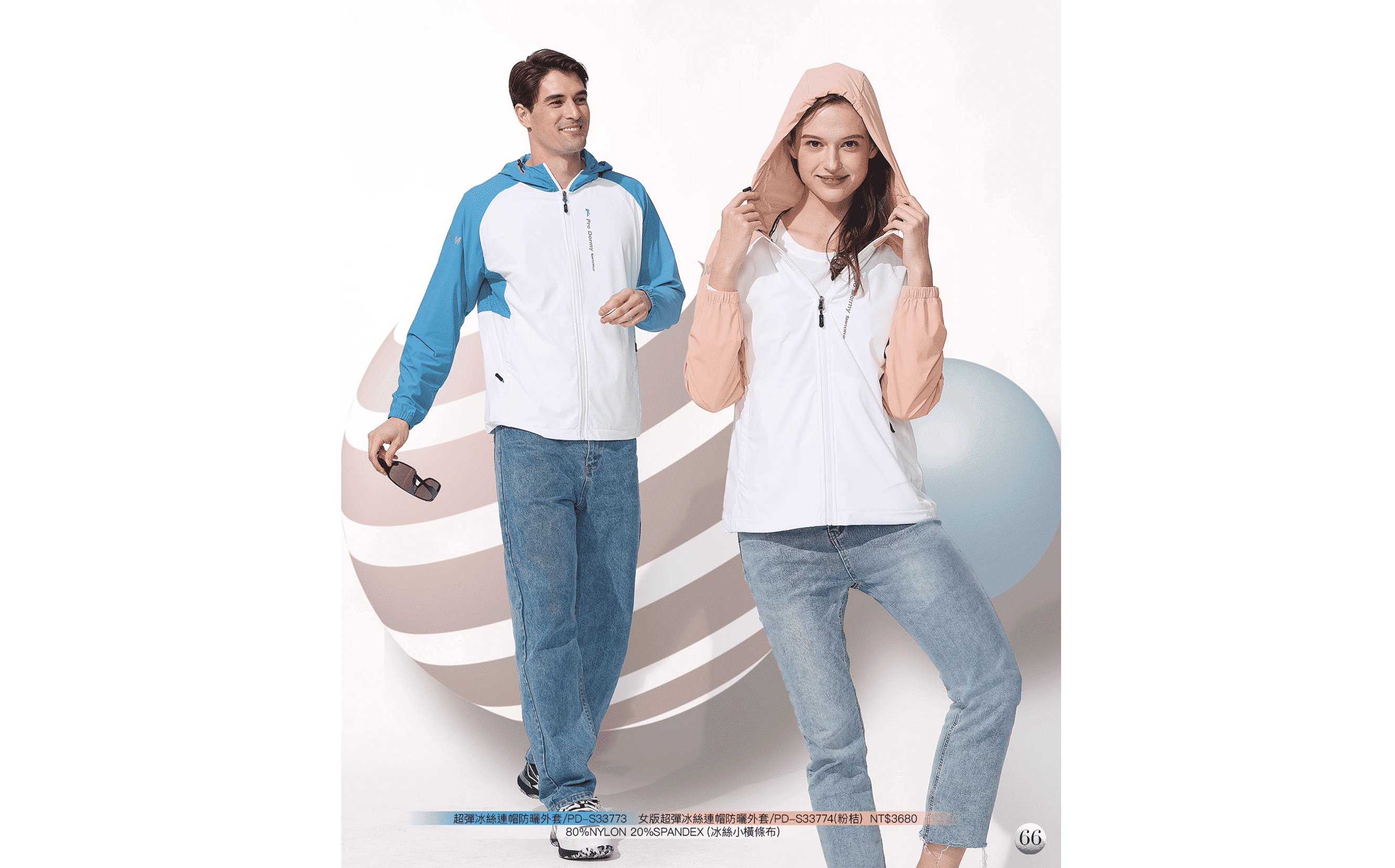 NT$3680 PD-S 33773 (白色/藍色)、PD-S33774 (白色/粉桔-女版) 80%NYLON 20%SPANDEX (冰絲小橫條布)