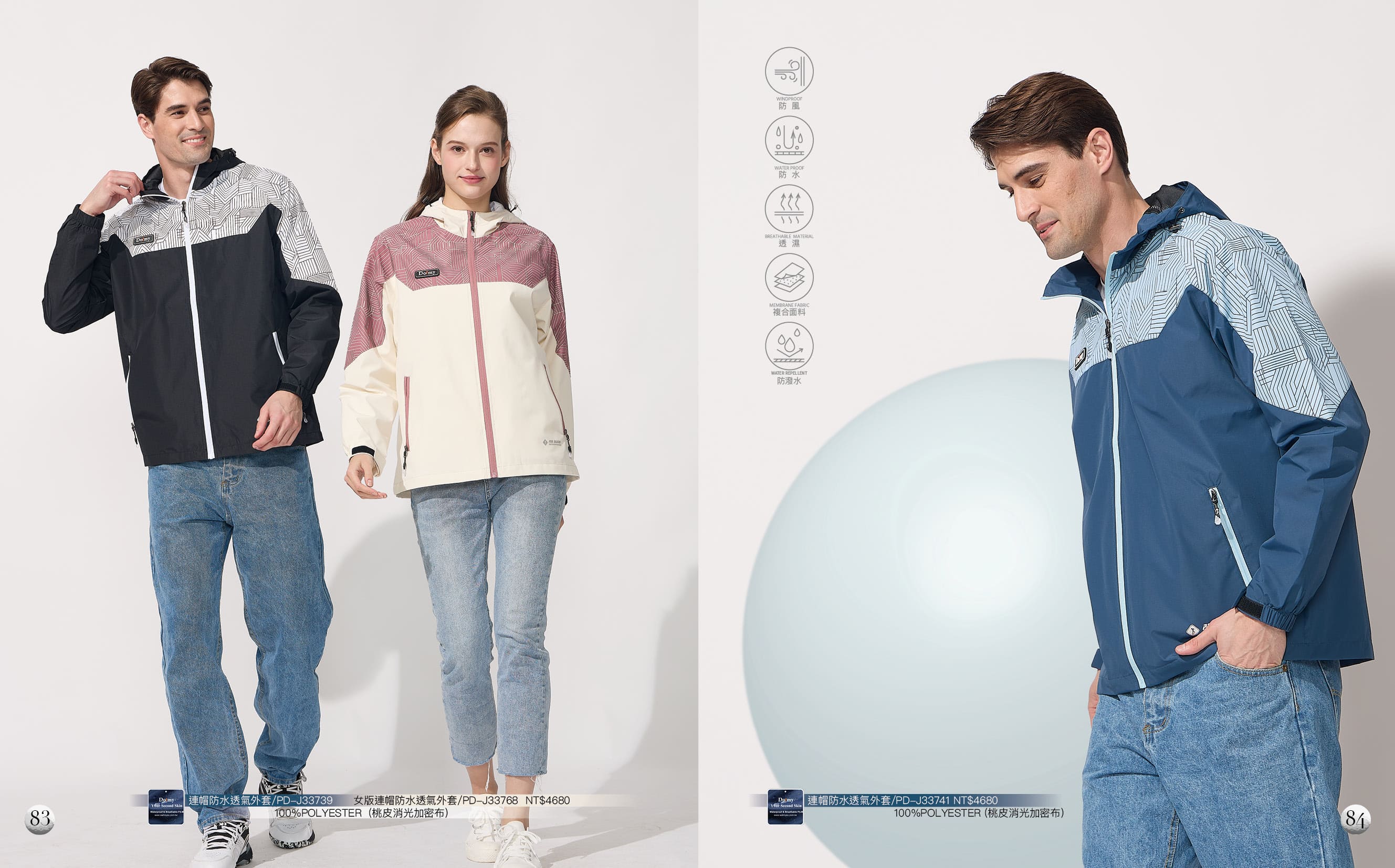NT$4680 PD-J 33739(黑色/白色) PD-J33768(米色/粉色-女版) PD-J 33741(灰藍/淺藍) 100%POLYESTER (桃皮消光加密布)