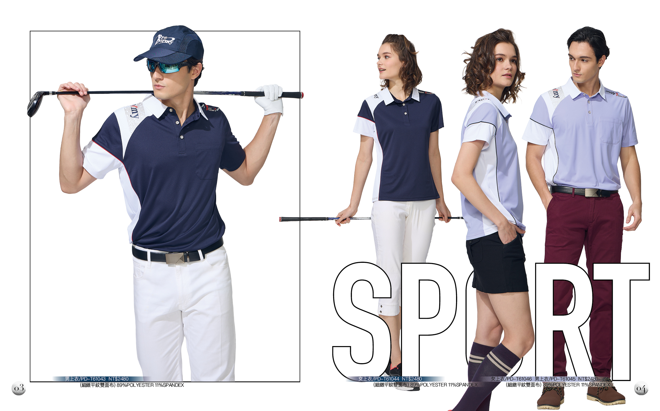 NT$2480 男:PD-T 61043 (丈青)、 PD-T 61045 (淺紫) 女:PD-T 61044 (丈青)、 PD-T 61046 (淺紫) 89%POLYESTER 11%SPANDEX (細緻平紋雙面布)
