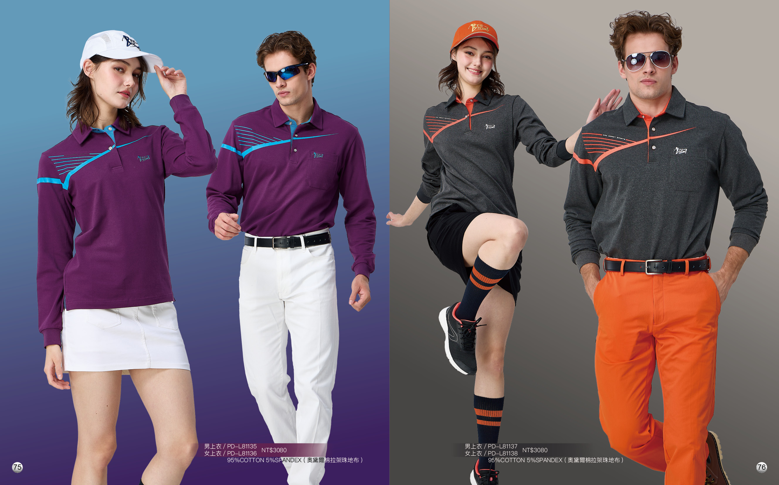 NT$2880男:PD-L 81083 (藍色)、PD-L 81085 (橘色)女:PD-L 81084 (藍色)、PD-L 81086 (橘色)95%COTTON 5%SPANDEX(冰瓷棉彈力布)