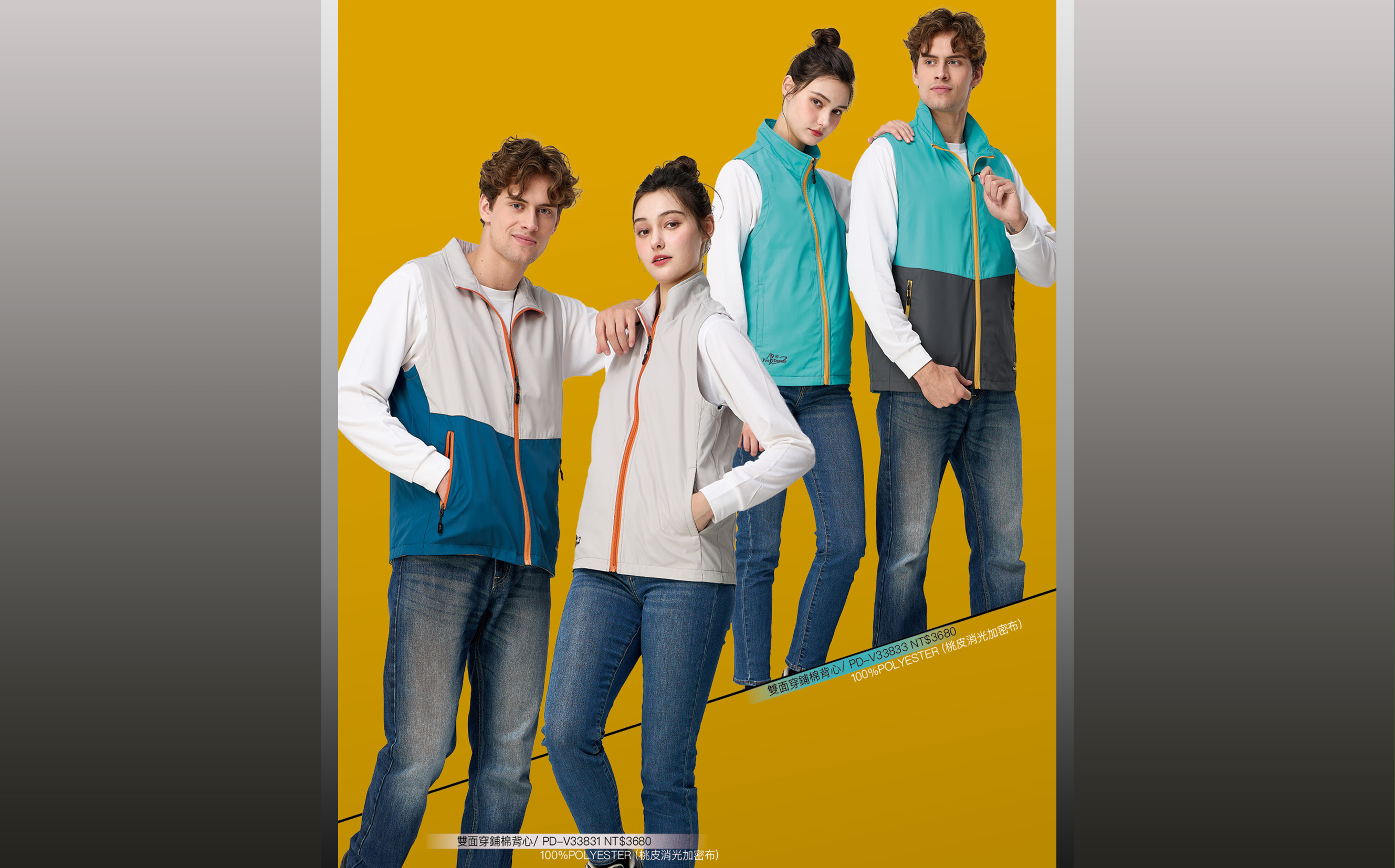 NT$3680 PD-V 33831 (寶藍/淺卡 ) PD-V 33833 (深灰/湖綠) 100%POLYESTER (桃皮消光加密布)